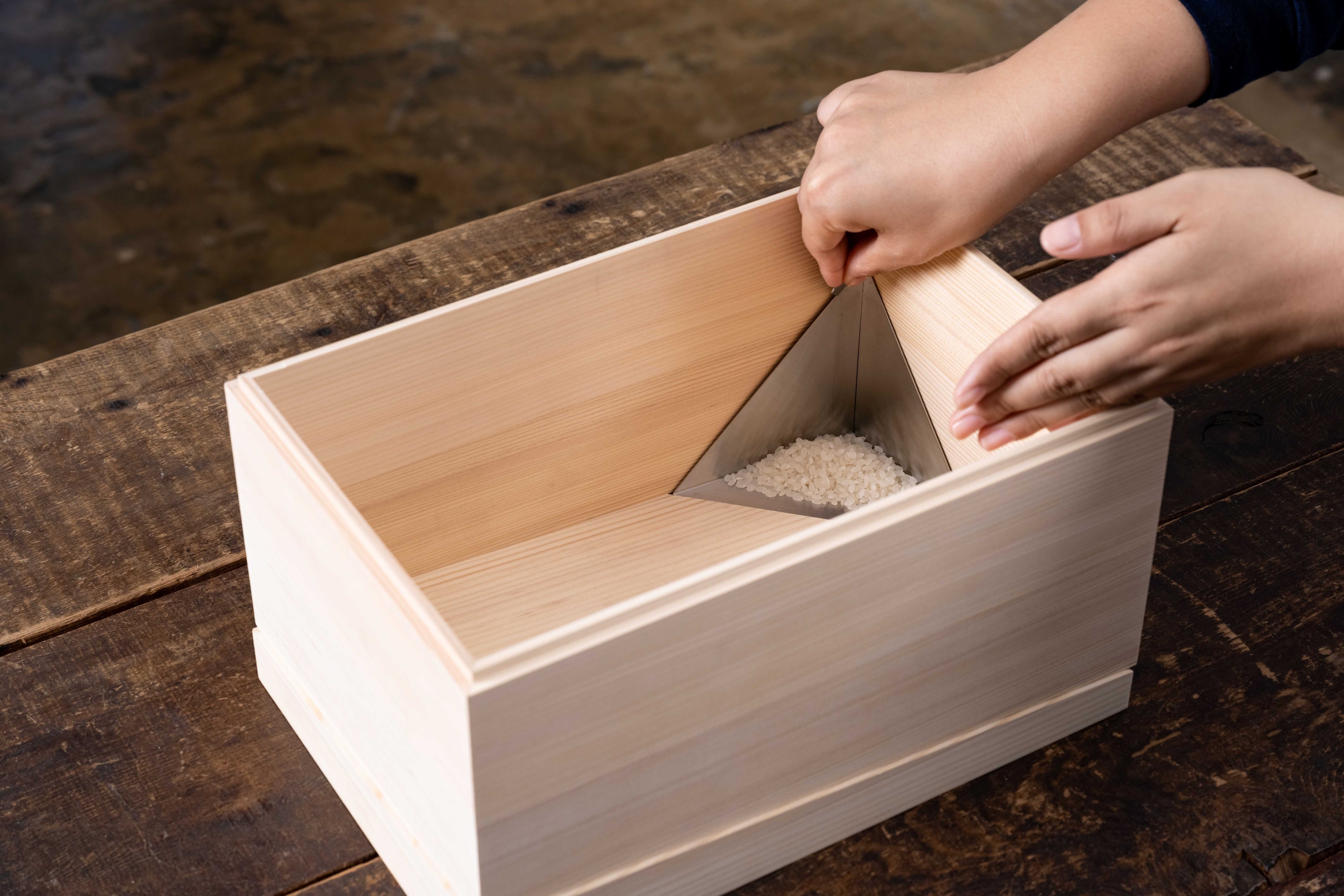 高級ヨーロッパ樅(モミ)を使用した米びつ。樅の効能×斬新なデザイン。内部の角には受け皿が設置され、少なくなったお米はここに集めて最後の1 粒まで無駄なく、米びつを持ち上げることなく取り出すことができます。