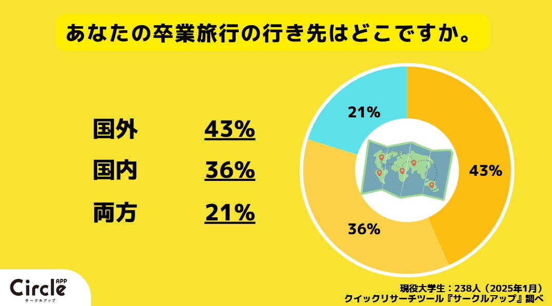 卒業旅行に行く現役大学生の43%が国外のみ、36%が国内のみ、21%が国外国内両方に行く、と回答しました。