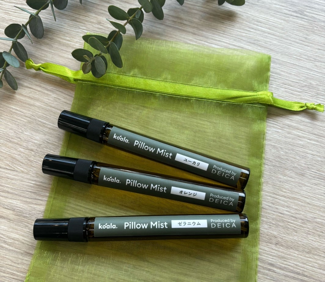 人気アロマブランド、DEICAとのコラボレーションで誕生した3本セットのピローミストです。深い呼吸を促す「ユーカリ」、心を和らげてくれる「オレンジ」、リラックスした眠りに誘う「ゼラニウム」の3つの香りを自由に組み合わせて、自分好みのピローミストとしてご愛用いただけます。「コアラオリジナルピローミスト」8ml×3本セット(非売品)