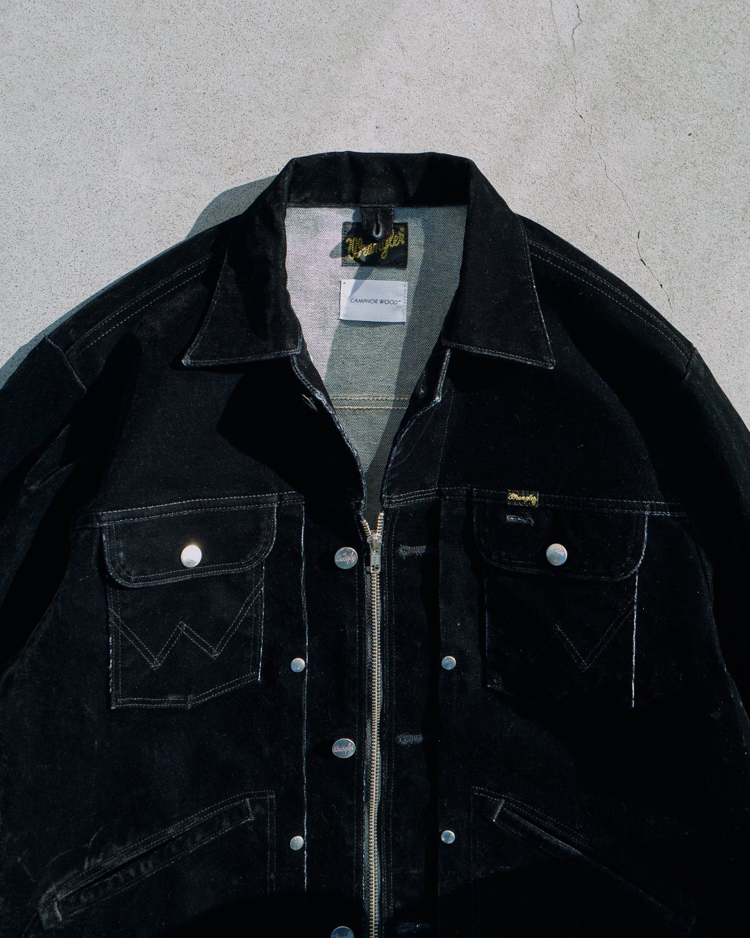 今回のコラボレーションでは、昨年より好評のWranglerの名作モデル「124MJ」と「24MJZ」をCAMPHORWOODの解釈で融合させた2WAY仕様のデニムトラッカージャケットと、CAMPHORWOODの定番シルエットをWranglerのブロークンデニムで仕立てたワイドバギーパンツの全2型を展開。また今年よりブロークンデニムにフロッキープリントを施した、新色「FROCKEY BLACK」を加えてリリース。