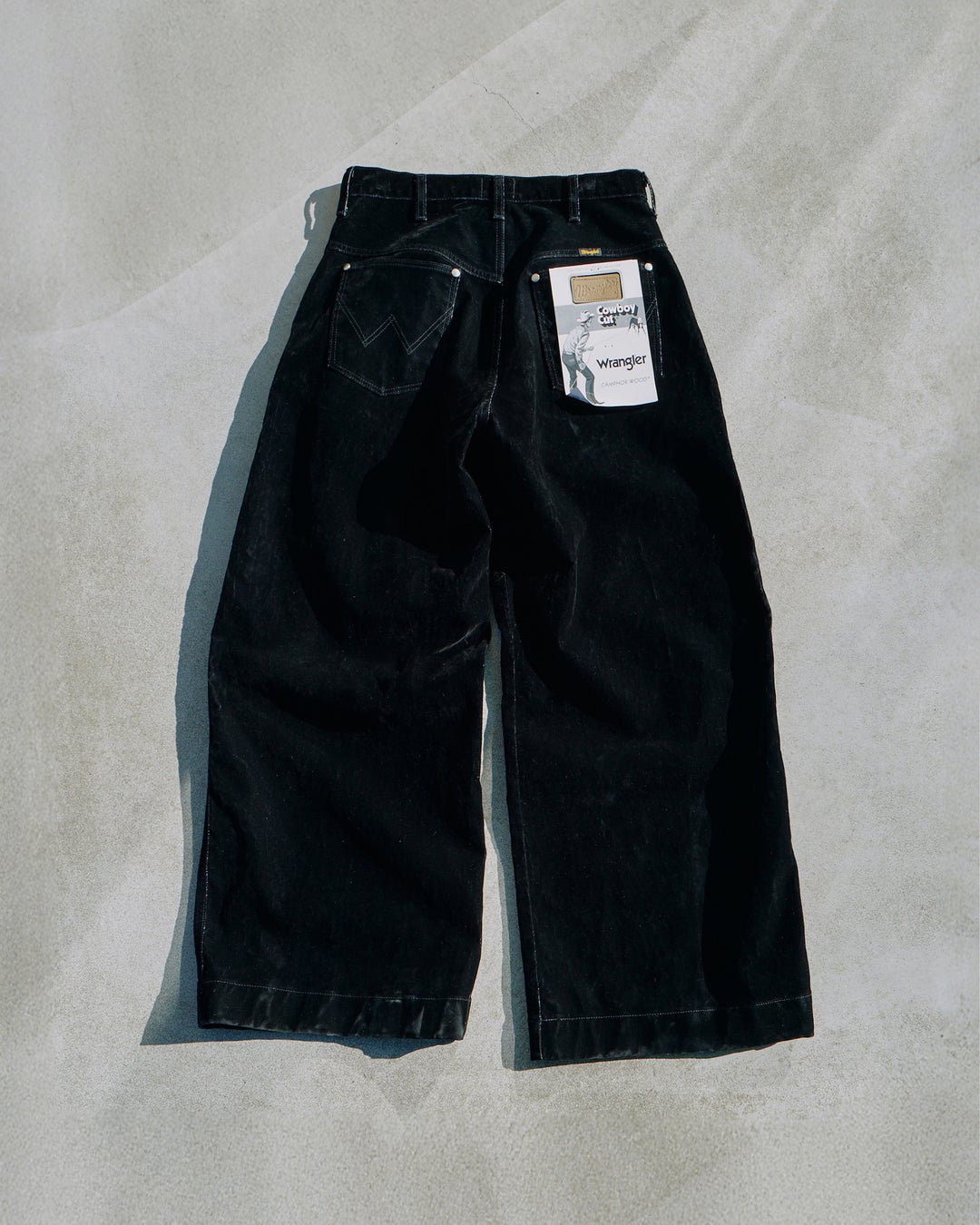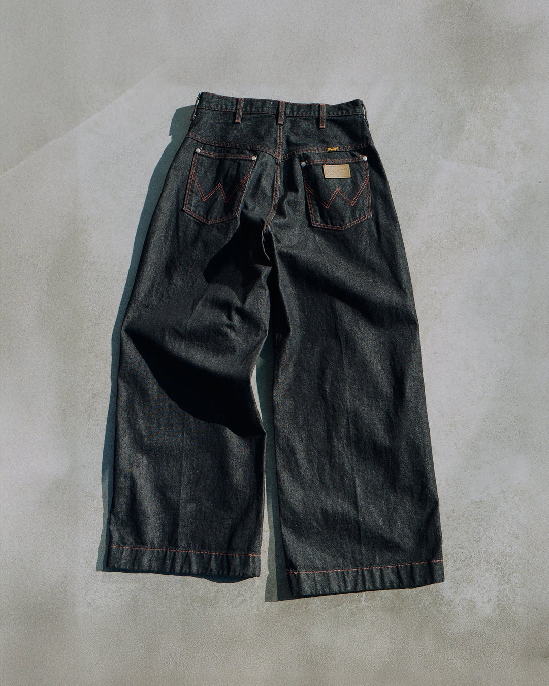 ブランド定番の2タックワイドバギーフレアスラックスをベースに、WRANGLERのブロークンデニムに落とし込んだワイドトラウザーズ。