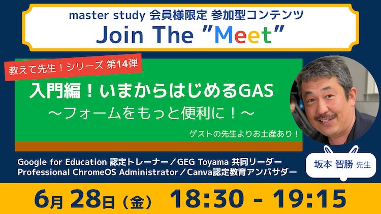 『入門編!いまからはじめるGAS 〜フォームをもっと便利に!〜』というテーマで、Google フォームのバージョンアップを例に、坂本先生がGASの入門編として易しくお話ししてくださいます!GASは「Google Apps Script」の略で、Google が提供するアプリケーション開発プラットフォームです。Google サービスの連携・自動化・拡張などを可能にして、より便利な活用を促進します。「気になっているけれどなんだか難しそう…」とお悩みの皆様、坂本先生に基礎から教えていただけるこの機会をお見逃しなく!