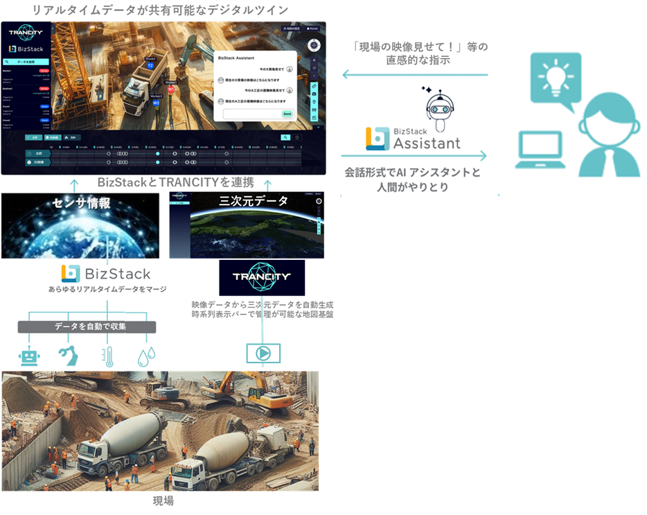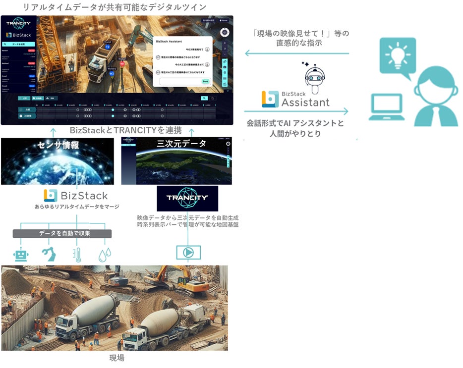 今回の連携により、BizStackで収集したリアルタイムデータをTRANCITYで自動生成した三次元データにプロットすることで、デジタルツイン空間内での一括管理が可能となり、AIアシスタントによりいつでもどこでも簡単にリアルタイムデータにアクセスできる、高度なデジタルツインの実現を目指します。