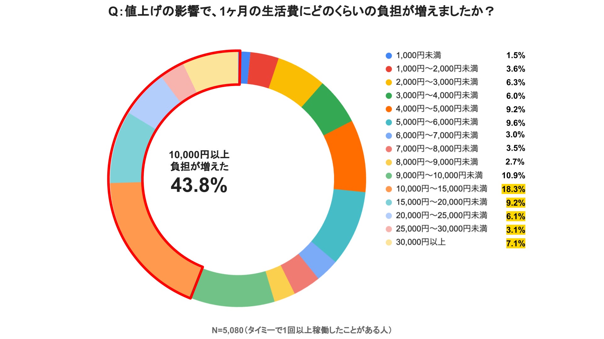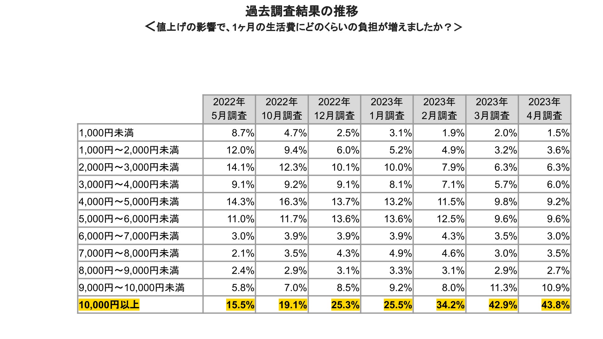 値上げによる生活費の負担増加額に関する回答では、43.8%の人が一月の生活費で10,000円以上負担が増えたと回答し、前回調査の回答(42.9%)から引き続き40%を超え、家計への影響が鮮明にあらわれている。