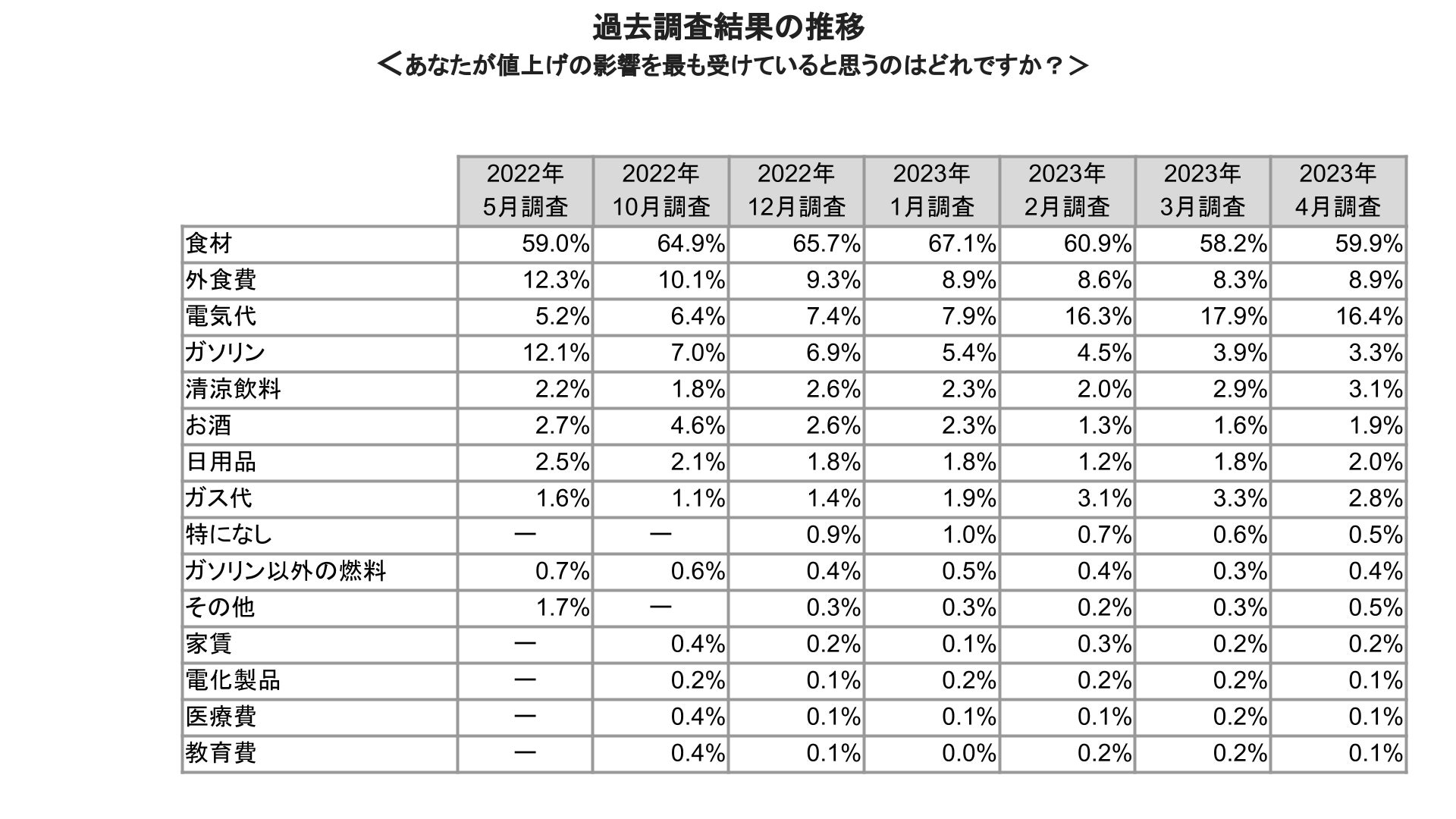 値上げの影響を最も感じているものは過去調査から引き続き「食材」で、59.9%の方が回答しており、「電気代」や「ガス代」など生活インフラへの影響も前月から継続して上位に入っている。
