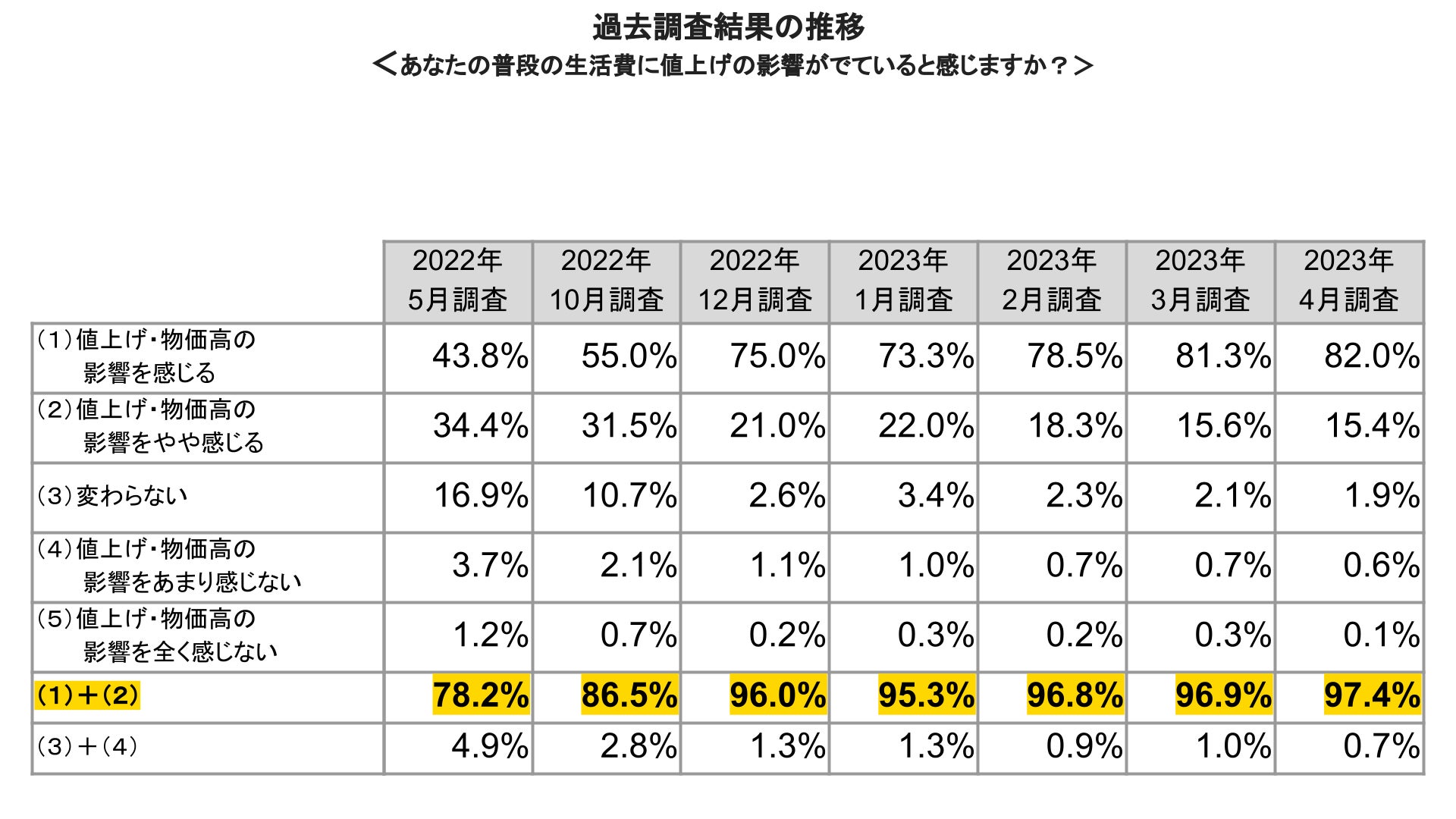 ■2021年12月と現在を比べて、普段の生活費に値上げの影響が出ていると感じている人は、97.4%という結果になった。過去の調査結果の推移からみても、高止まりしている状態がわかる。