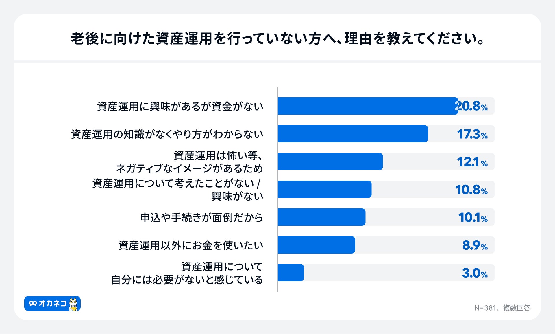 一方で、今回行った調査のサマリー外で出た結果の中では、資産運用を行っていない方の理由として、「興味があるが資金がない」「知識がなくやり方がわからない」「資産運用は怖い等、ネガティブなイメージがあるため」といった理由が挙げられており、実際にオカネコでもそのようなご相談は多く、そのような方には、資産運用の知識が無くても少額からスタートできる運用方法をお伝えしております。