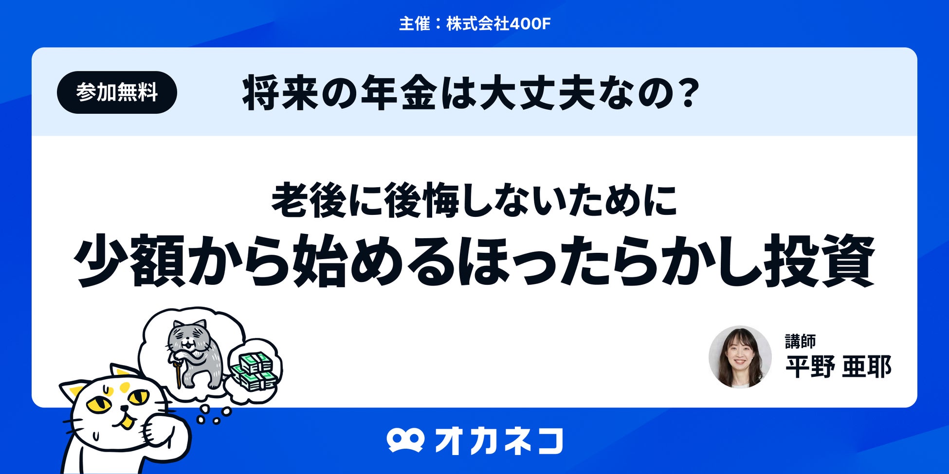 【オカネコ 老後資金の意識調査】結果を受け、オンラインセミナー開催決定!「将来の年金は大丈夫なの?老後に後悔しないために ~少額から始めるほったらかし投資~」