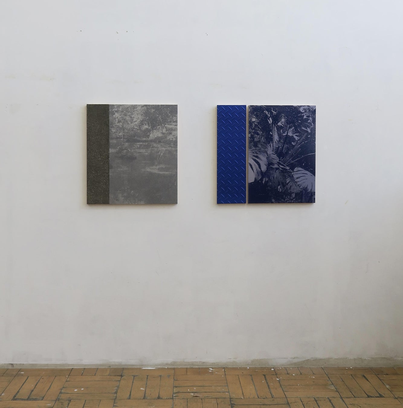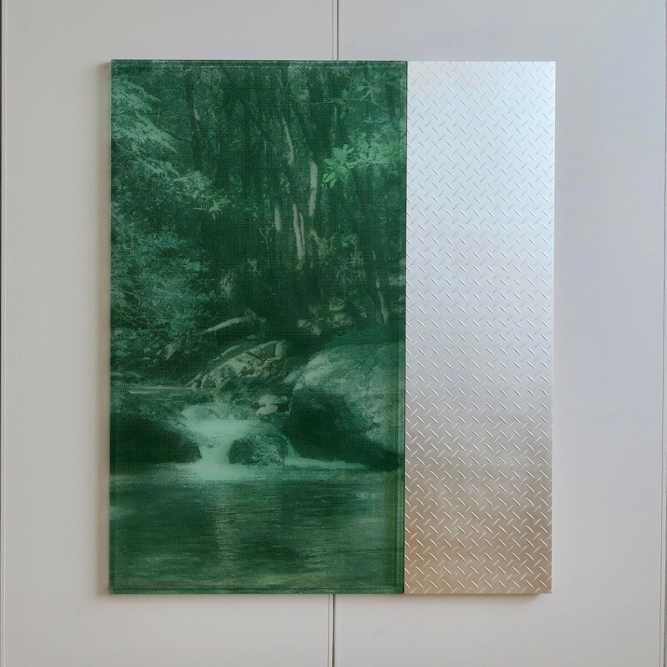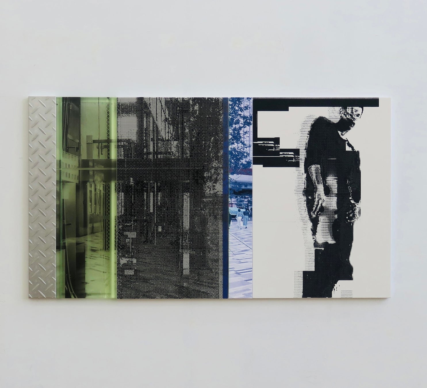 様々なマテリアルに印刷されたラスタ画像の上に網戸のように糸を引き、外から覗く窓として構成したデジタルイメージ。明治維新が齎した産業革命と日本画の興り、現代日本の都市風景の象徴として日本画材を用いて制作した縞鋼板のシミュレーション。それぞれが内側と外側の世界を担当し、展示空間で再配置される。