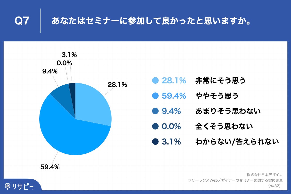 Q1で「ある」と回答した方に、「Q7.あなたはセミナーに参加して良かったと思いますか。」(n=32)と質問したところ、「非常にそう思う」が28.1%、「ややそう思う」が59.4%という回答となりました。