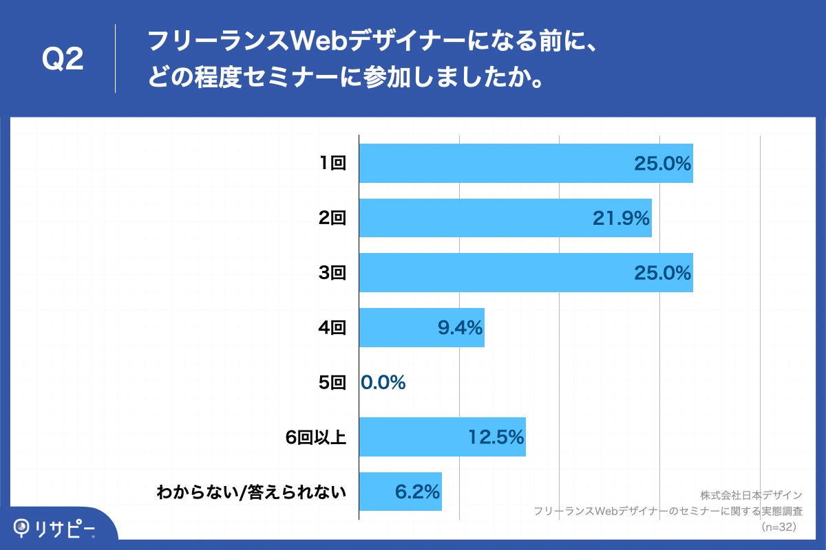 Q1で「ある」と回答した方に、「Q2.フリーランスWebデザイナーになる前に、どの程度セミナーに参加しましたか。」(n=32)と質問したところ、「1回」が25.0%、「3回」が25.0%、「2回」が21.9%という回答となりました。
