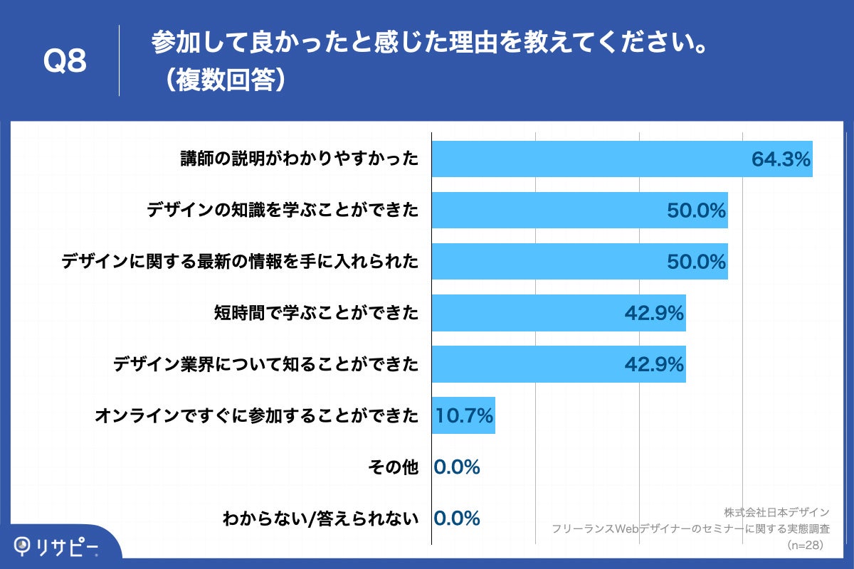 Q7で「非常にそう思う」「ややそう思う」と回答した方に、「Q8.参加して良かったと感じた理由を教えてください。(複数回答)」(n=28)と質問したところ、「講師の説明がわかりやすかった」が64.3%、「デザインの知識を学ぶことができた」が50.0%、「デザインに関する最新の情報を手に入れられた」が50.0%という回答となりました。