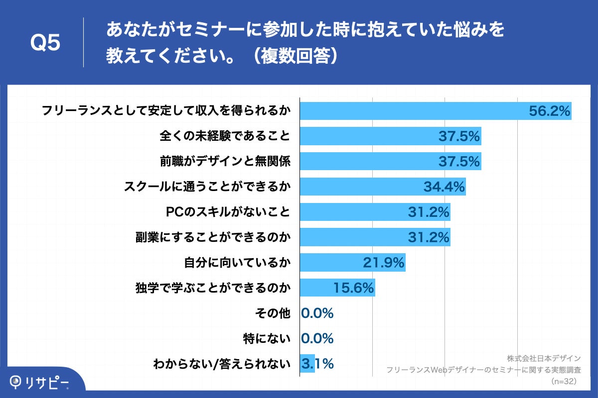 Q1で「ある」と回答した方に、「Q5.あなたがセミナーに参加した時に抱えていた悩みを教えてください。(複数回答)」(n=32)と質問したところ、「フリーランスとして安定して収入を得られるか」が56.2%、「全くの未経験であること」が37.5%、「前職がデザインと無関係」が37.5%という回答となりました。