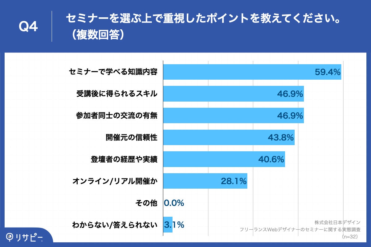 Q1で「ある」と回答した方に、「Q4.セミナーを選ぶ上で重視したポイントを教えてください。(複数回答)」(n=32)と質問したところ、「セミナーで学べる知識内容」が59.4%、「受講後に得られるスキル」が46.9%、「参加者同士の交流の有無」が46.9%という回答となりました。