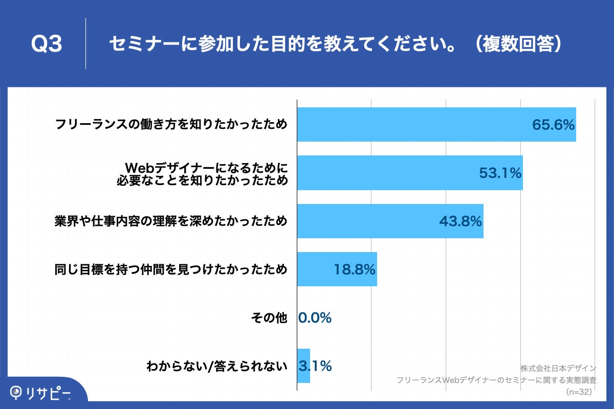 Q1で「ある」と回答した方に、「Q3.セミナーに参加した目的を教えてください。(複数回答)」(n=32)と質問したところ、「フリーランスの働き方を知りたかったため」が65.6%、「Webデザイナーになるために必要なことを知りたかったため」が53.1%、「業界や仕事内容の理解を深めたかったため」が43.8%という回答となりました。