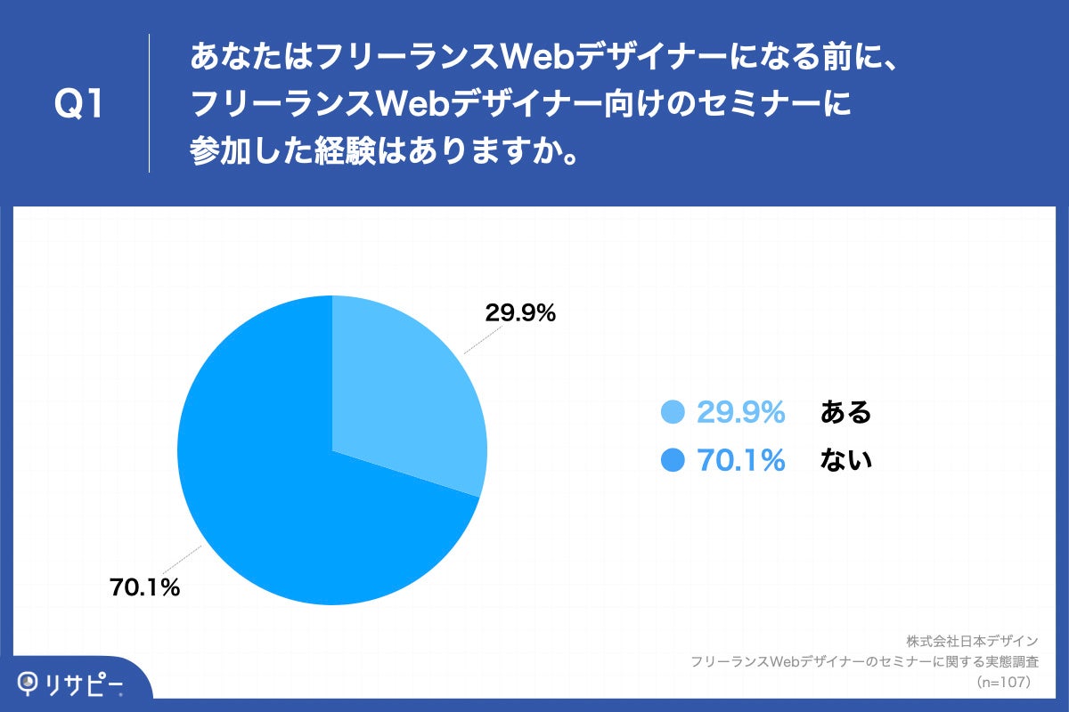 「Q1.あなたはフリーランスWebデザイナーになる前に、フリーランスWebデザイナー向けのセミナーに参加した経験はありますか。」(n=107)と質問したところ、「ある」が29.9%、「ない」が70.1%という回答となりました。