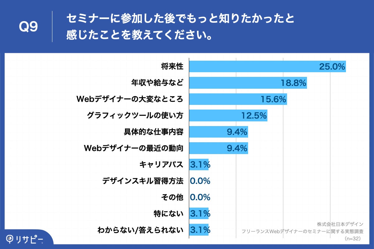 Q1で「ある」と回答した方に、「Q9.セミナーに参加した後でもっと知りたかったと感じたことを教えてください。」(n=32)と質問したところ、「将来性」が25.0%、「年収や給与など」が18.8%、「Webデザイナーの大変なところ」が15.6% という回答となりました。