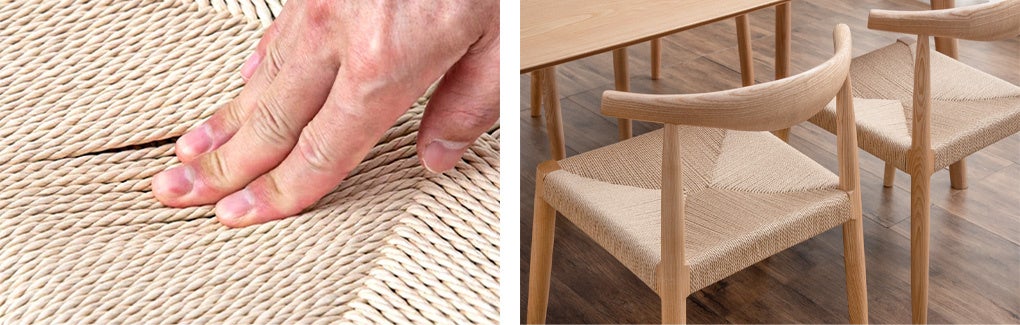 上でも記載した通り、“ペーパーコード”とはその名の通り紙を材料とした家具用の紐で、樹脂を浸透させた紙を撚り合わせてつくる素材です。紙が素材ではありますが、革や布張りに負けない耐久性の高さが特徴で、北欧家具のチェアの座面にもよく使われています。細いコードを丁寧に編み上げたデザインはナチュラルで軽やかな印象があり、北欧テイストだけでない様々なコーディネートに合わせやすい見た目が特徴です。