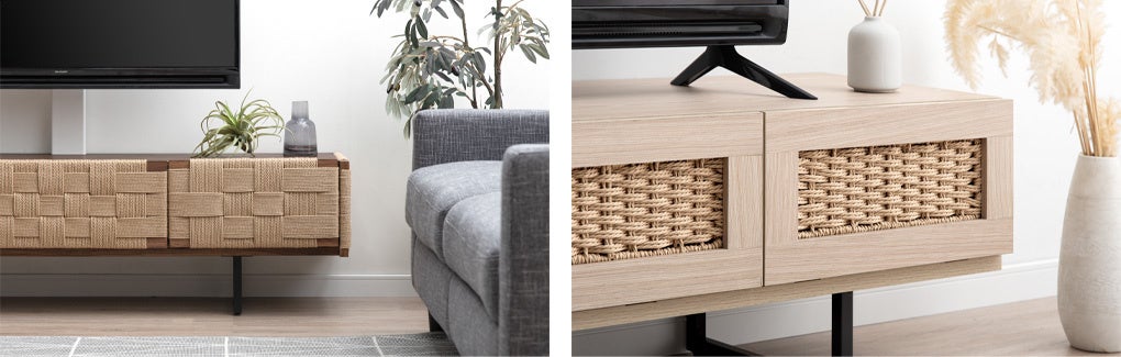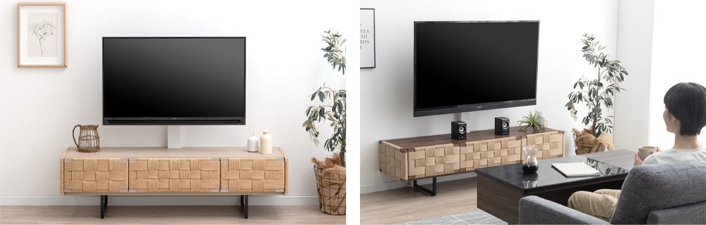 タンスのゲンより、ペーパーコードを用いたテレビ台とスタンド付きテレビ台が新たに登場!手作業で編み込まれた温かみある質感がアクセントになり、様々なテイストのお部屋と優しく馴染む