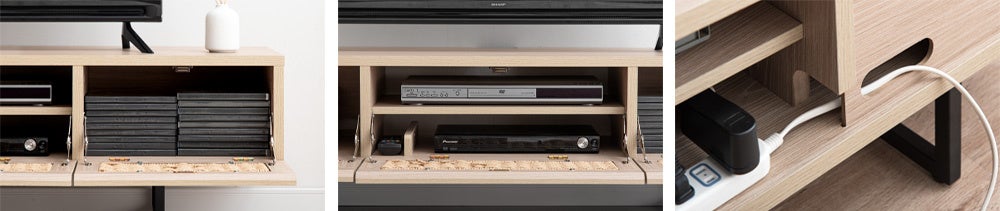 (↑写真左:左右の扉収納はCDや小物の収納が可能 /写真中央:中央の扉収納はAV機器にピッタリな棚板付き/写真右:裏面にはコードを逃がす穴があるのでスッキリと片付け可能)