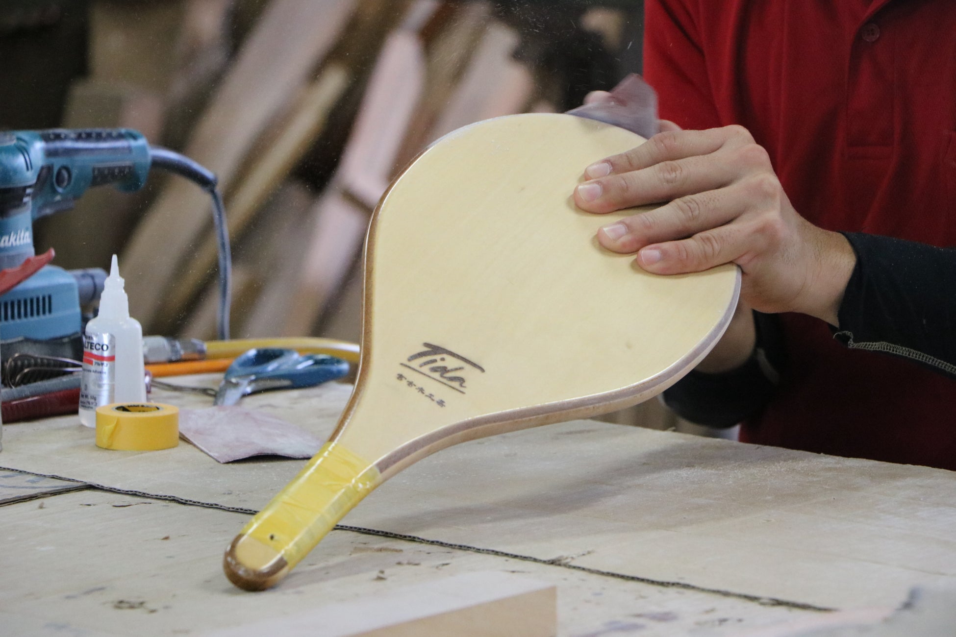 「シナ」は、軽量でやわらかく、木目が鮮やかなことが特徴。そのため、ラケットコントロールが容易で、軽やかでソフトな打感が魅力の一本です。一方の「イヌマキ」は、かつて上等な高級建築材として琉球王朝に上納することが義務付けられていたほどの木材。堅さがあって丈夫なことが特徴で、弾けるような打感の気持ちよさが魅力の一本です。