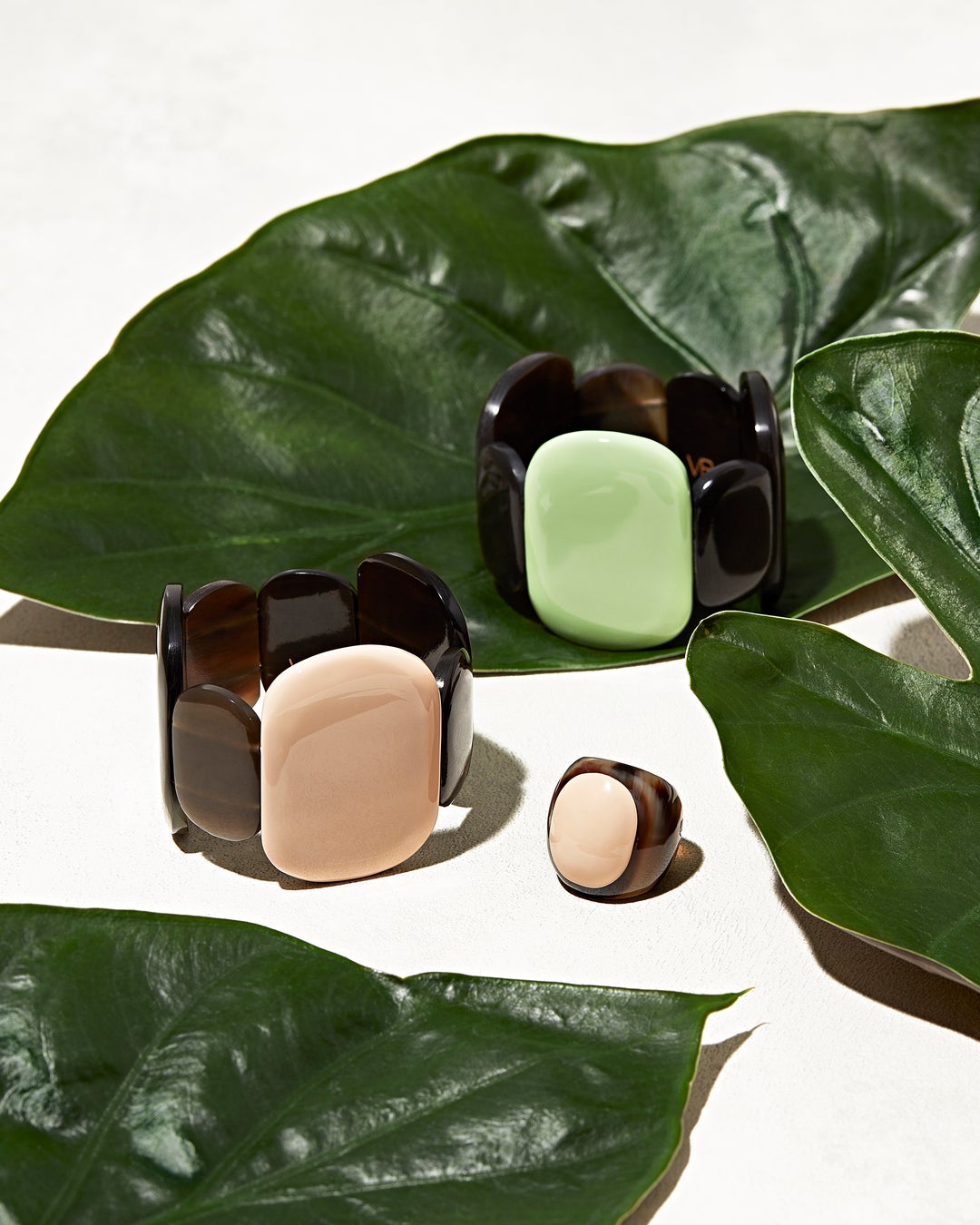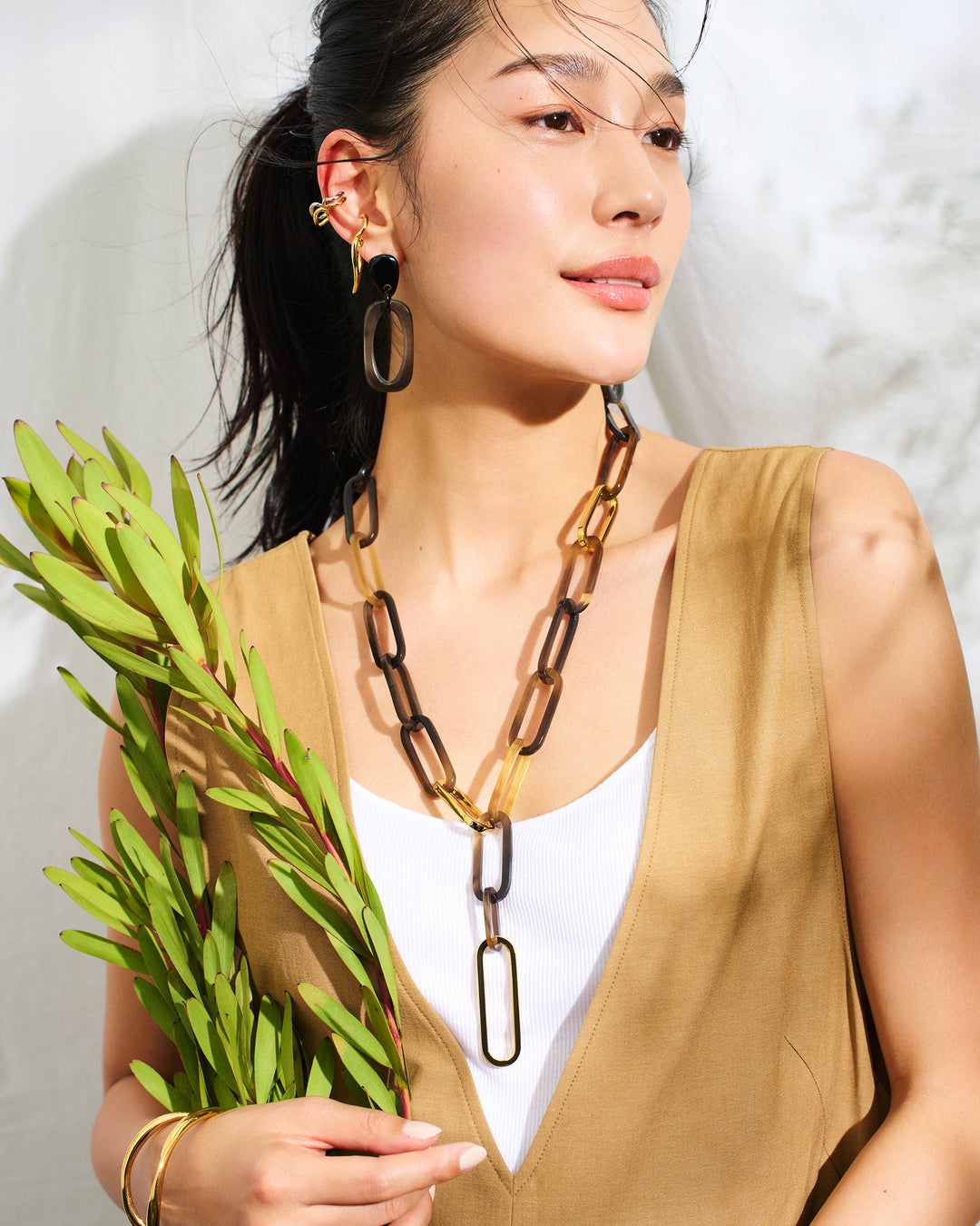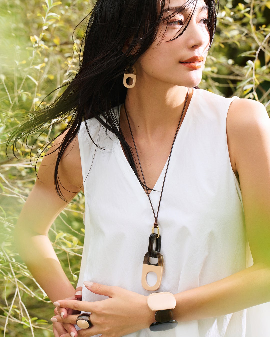 自然素材ならではの風合いが美しい水牛アクセサリーは、ニュートラルなベージュカラーとアクセントになるライムグリーンを差し色にした2色展開。夏の季節にパワーを感じる大振りなアイテムです。
