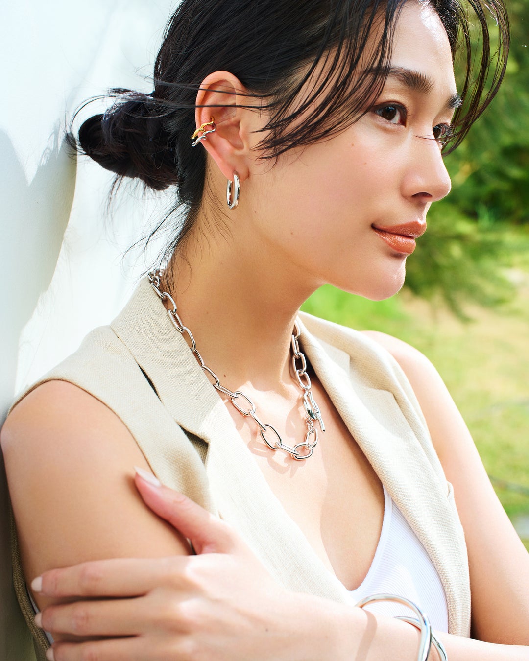 チェーンネックレスは、程よいボリューム感で、デコルテをクールに演出。マンテル金具を前に持ってくることでコーディネートのポイントになります。 動きのある立体的なバングルは、ディテールまでこだわったエッジの効いたデザイン。ひとつで存在感ある印象的な手元に。