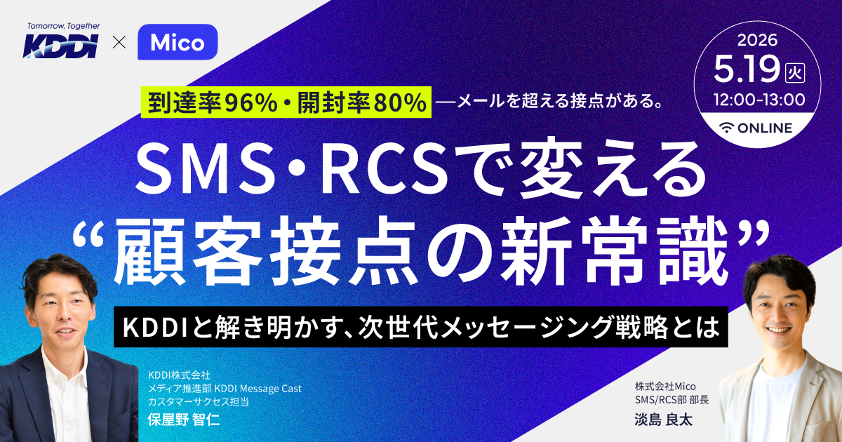 株式会社Mico(本社:大阪市北区、代表取締役社長:山田 修)は、KDDI株式会社(本社:港区高輪、代表取締役社長CEO:松田 浩路)との共催により、SMS・RCSを活用した顧客接点の最適化と歩留まり改善をテーマとしたウェビナー『「SMS・RCSで変える顧客接点の新常識」~KDDIと解き明かす、次世代メッセージング戦略とは~』を、2026年5月19日(火)12:00〜13:00にオンラインにて開催いたします。