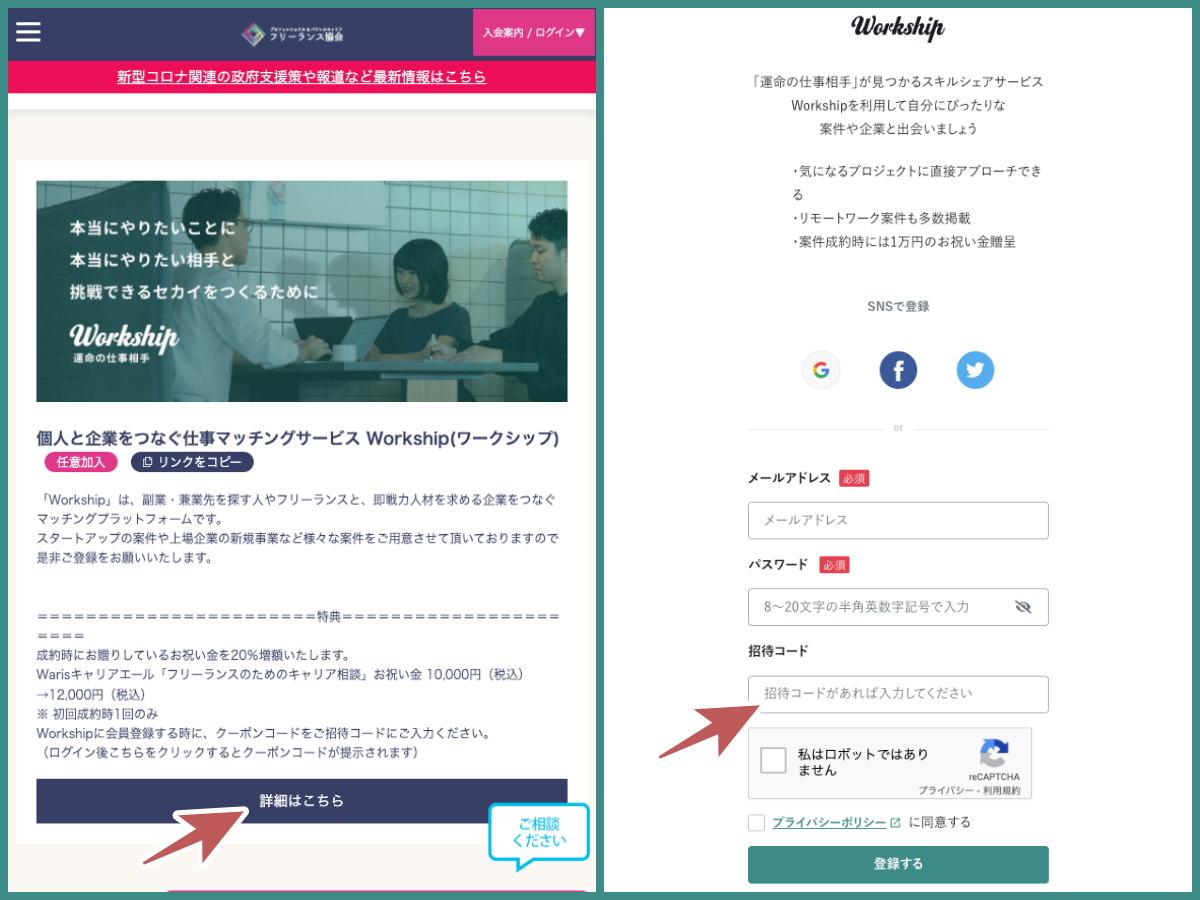 Workshipへの会員登録の際、フリーランス協会 ベネフィット紹介ページにて発行されるクーポンコードを「ご招待コード」欄にご入力ください。