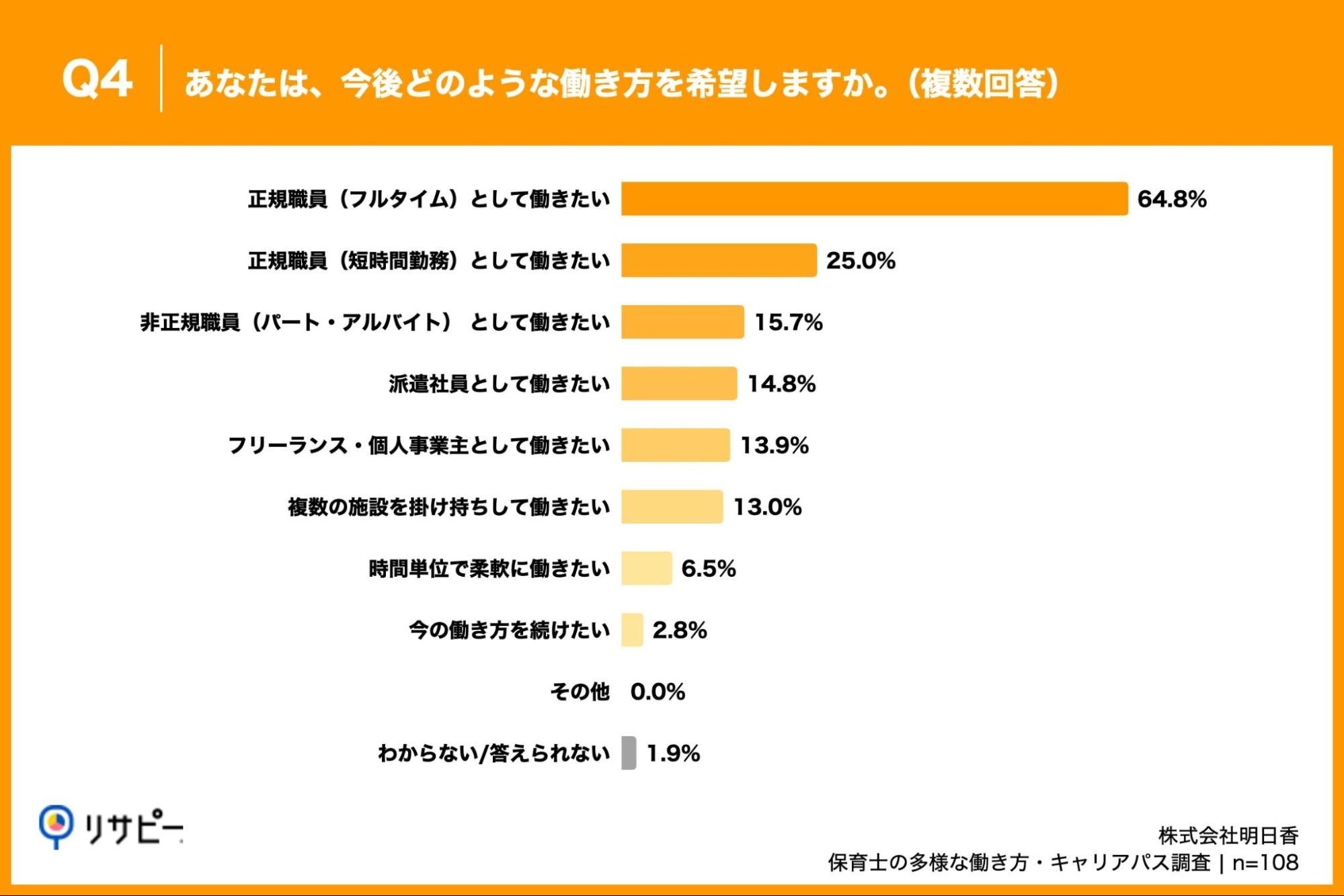 「Q4. あなたは、今後どのような働き方を希望しますか。(複数回答)」(n=108)と質問したところ、「正規職員(フルタイム)として働きたい」が64.8%、「正規職員(短時間勤務)として働きたい」が25.0%、「非正規職員(パート・アルバイト)として働きたい」が15.7%という回答となりました。