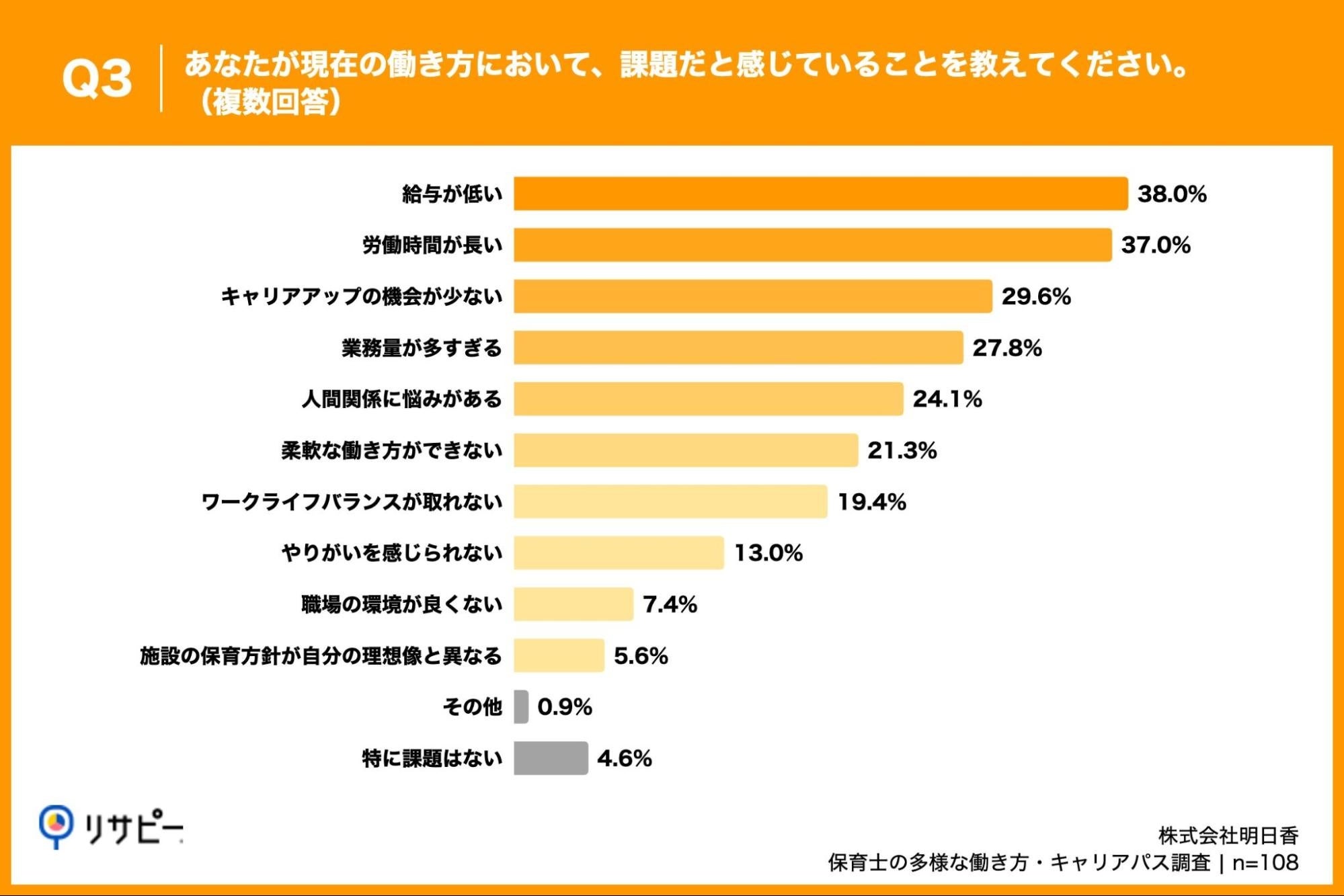 「Q3. あなたが現在の働き方において、課題だと感じていることを教えてください。(複数回答)」(n=108)と質問したところ、「給与が低い」が38.0%、「労働時間が長い」が37.0%、「キャリアアップの機会が少ない」が29.6%という回答となりました。
