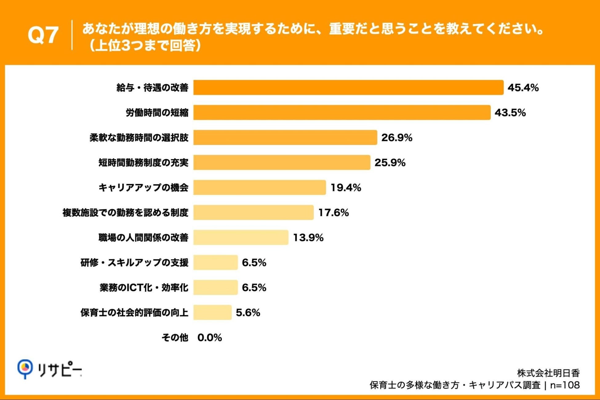 「Q7. あなたが理想の働き方を実現するために、重要だと思うことを教えてください。(上位3つまで回答)」(n=108)と質問したところ、「給与・待遇の改善」が45.4%、「労働時間の短縮」が43.5%、「柔軟な勤務時間の選択肢」が26.9%という回答となりました。