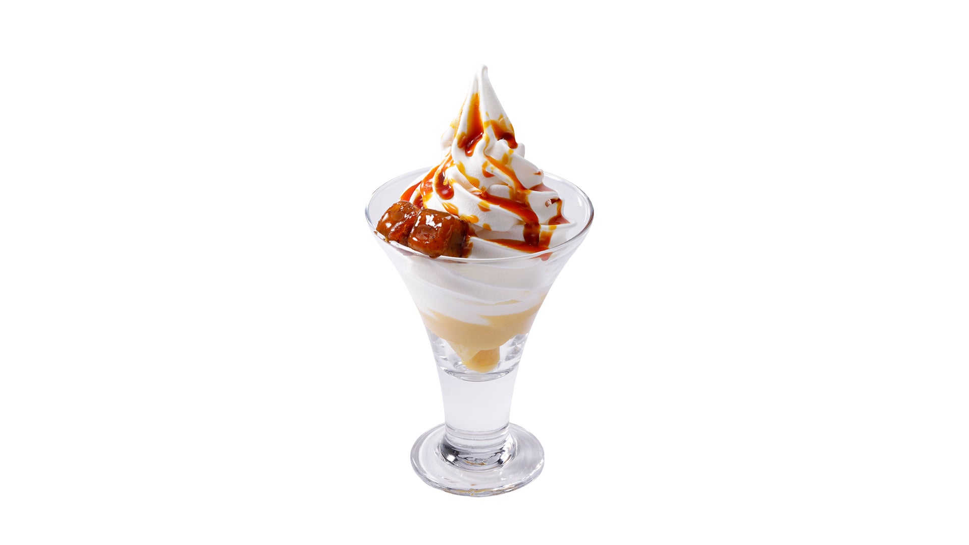 北海道ソフトクリームと香ばしいカラメルを合わせ、トッピングされた大学いもがアクセントに。食後にぴったりな小さめサイズのデザートです。