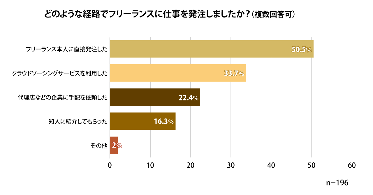 ・発注経路は「本人に直接発注」が最多となるも、発注の課題として「人材探しに時間がかかる」という回答が多い
