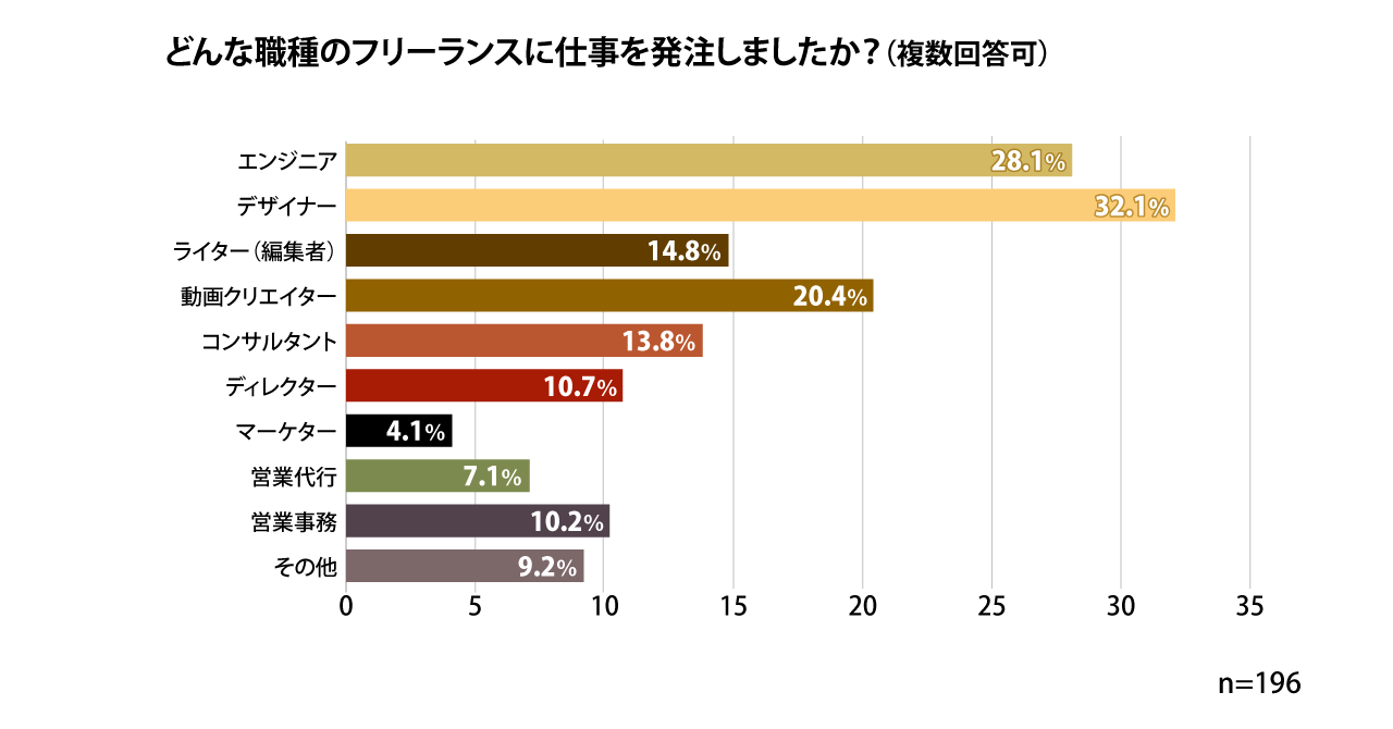 ・仕事を発注するフリーランスの職種はデザイナーやエンジニアが多く、動画クリエイターへの発注も目立つ