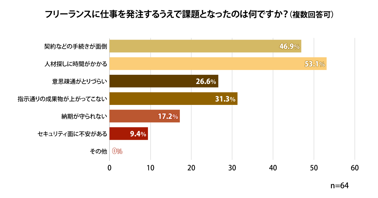 一方、「とても苦労した」「苦労した」と回答した人の発注における課題としては、「人材探しに時間がかかる」が最多となりました。