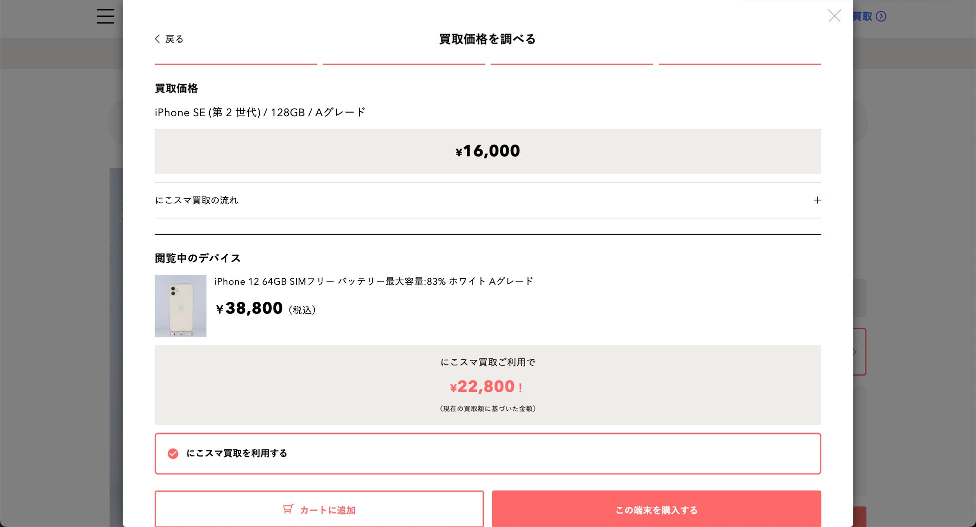 にこスマのサイト内での購入価格だけでなく、所有しているスマートフォンの買取価格を検討要素として示すことで、ユーザーは実質的な負担額を把握したスマートフォン選びが可能になります。