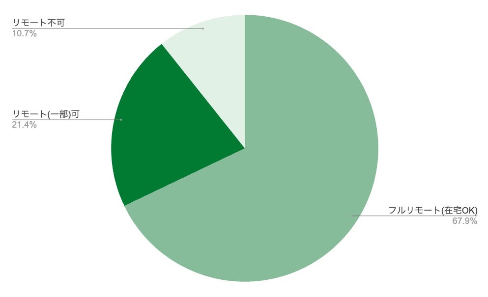 Django案件のリモートワーク対応状況を見ると、フルリモート可能な案件が67.9%と約7割を占めており、一部リモート可を含めると89.3%もの案件でリモートワークが認められています。リモート不可の案件はわずか10.7%に留まっており、Django開発者にとって非常に働きやすい環境が整っていることが分かります。この高いリモート対応率は、Webアプリケーション開発という性質上、場所に依存しない作業が可能であることを反映しています。フルリモートが7割近くを占める状況は、ワークライフバランスを重視するエンジニアにとって魅力的な選択肢となっています。