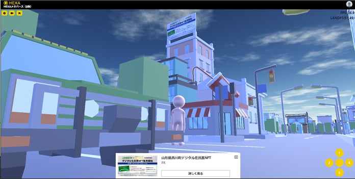 また今後西川町で検討を進める計画のHEXAメタバースの町中にも西川町デジタル住民票NFTのビル看板が出ております。HEXAメタバースのビル看板はこちら( https://meta.hexanft.com/ )からご確認いただけます。