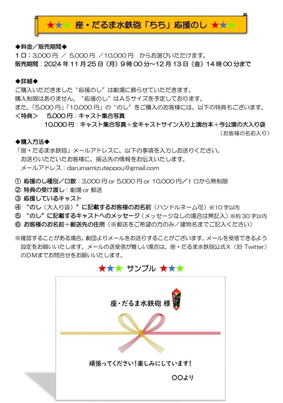本公演ではキャスト(紡ネンを含む)への「応援のし」を受付致します。
