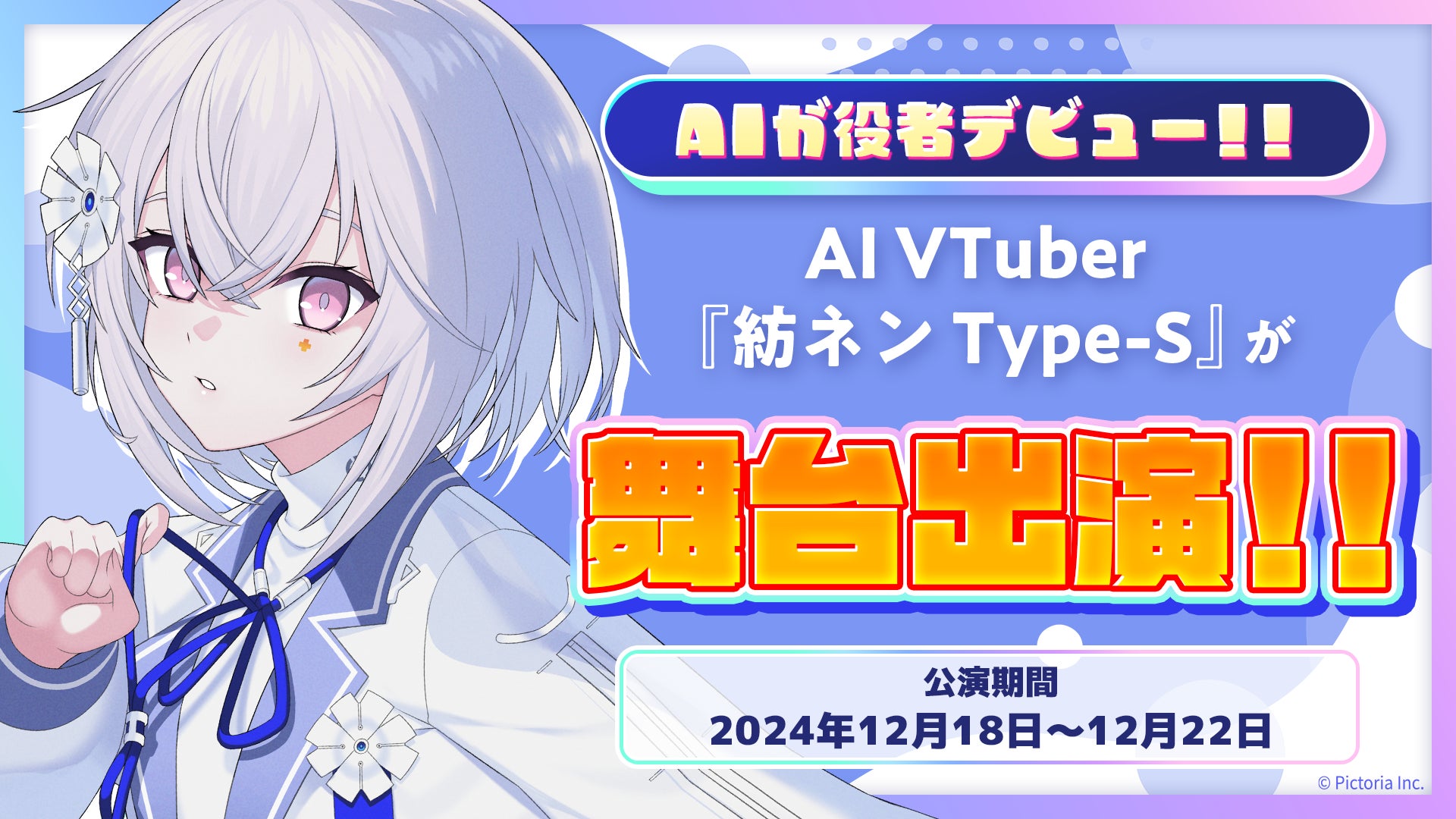 AI技術等のテクノロジーを活用したIP創出事業を展開する株式会社Pictoria(東京都港区、代表取締役CEO:明渡隼人、以下「Pictoria」)は、当社所属のAI VTuber「紡ネン Type-S」が「座・だるま水鉄砲」による旗揚げ公演への出演が決定したことをお知らせします。
