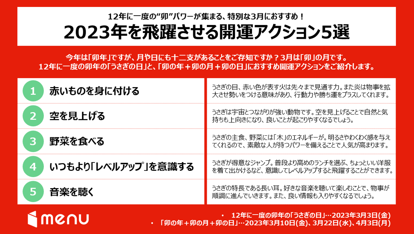 menu株式会社(本社:東京都新宿区、代表取締役:渡邉真)が運営するデリバリー&テイクアウトアプリ menuは12年に一度の“卯”パワーが集まる3月にあわせ、ぜひ試していただきたい「2023年を飛躍させる開運アクション5選」を提案します。さらに、menuでは3月3日(金)のうさぎの日・ひな祭りの本番までお得に楽しめる「ひな祭り・うさぎの日ディスカウント特集」を2月27日(月)~3月5日(日)の期間で開催中。その中からおすすめのグルメ4選をご紹介します。