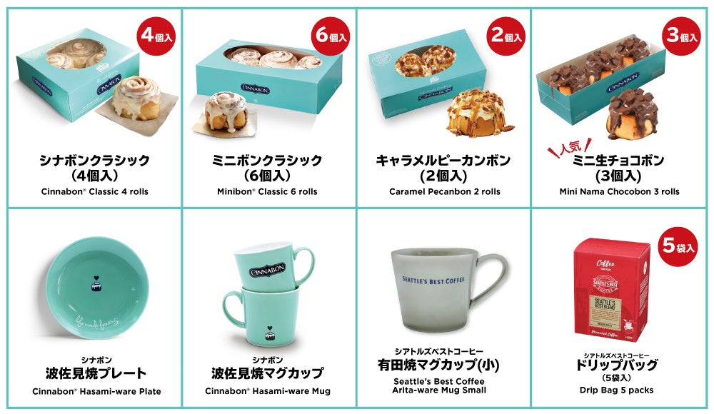 また、「シナボン」と相性が抜群の「シアトルズベストコーヒー」のドリップバッグコーヒーや、シナボングッズも豊富に取り揃えております。