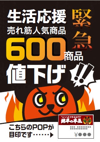 対象商品はホームセンター商品と綿半オリジナル商品を合わせた600商品です。食品をはじめ、日用雑貨、ヘルス&ビューティケア、家庭用品、インテリア、家電、ペット用品やカー用品など、様々な売れ筋人気商品を積極的に値下げしております。中には最大20%OFF以上の商品も…!