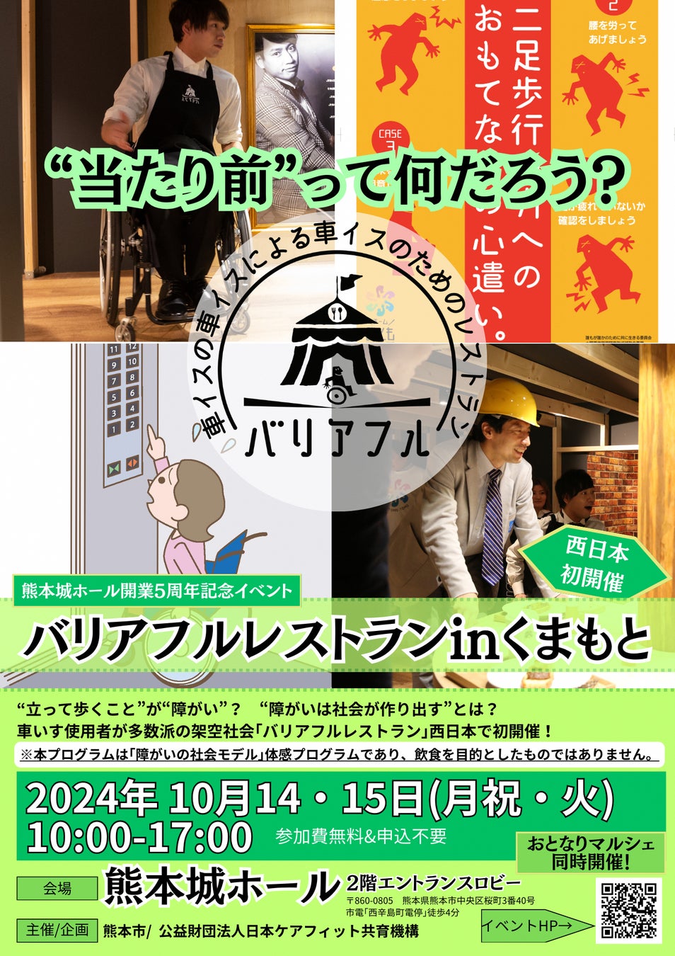 熊本市(市長:大西 一史)は、令和6年(2024年)10月14日(月祝)・15日(火)の2日間、熊本城ホールにて“障がいの社会モデル”について学習できる体験型イベント「バリアフルレストランinくまもと」を西日本で初めて開催します。