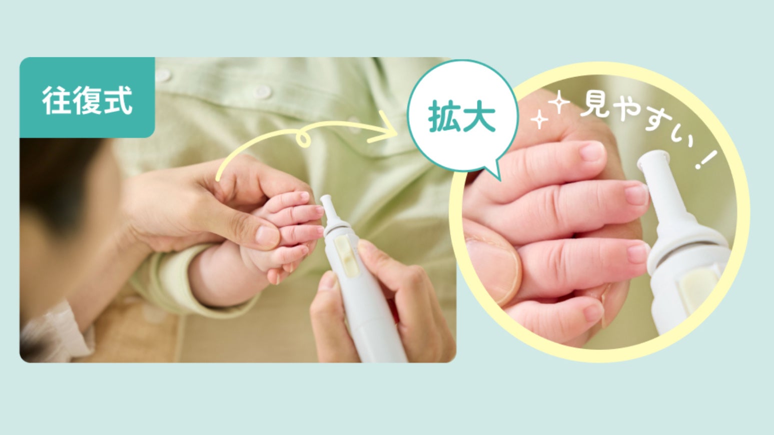 やすり部分が爪に対して並行に動く「往復式」は、安定して爪に当て続けられるため、赤ちゃんの小さな爪でもブレにくく、なめらかな形状に整えられます。深爪や、鋭利な爪先で自分の顔を引っ掻いてしまうといったトラブルから赤ちゃんを守ります。