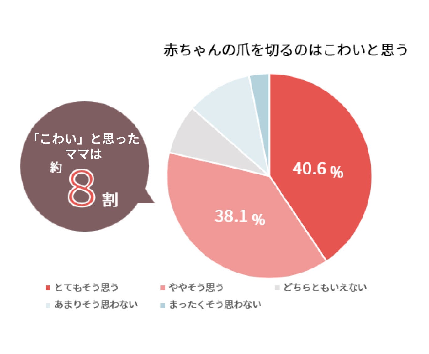 適切な爪ケアが大切な一方で、当社が実施した赤ちゃんの爪切りに関する調査(※2)では、約8割のママが「赤ちゃんの爪を切るのはこわいと思う」と回答。また、「赤ちゃんの小さな爪がよく見えず、指を傷つけそうになった」や「なめらかな形状に揃えようとして切りすぎ、深爪になってしまった」といったお悩みを抱えていることも明らかになりました。