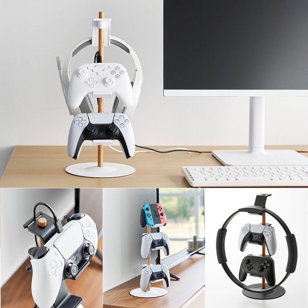 高さと向きを自由に調節でき、様々な種類のコントローラーやヘッドセットをスリムに収納できるゲームコントローラーラック。