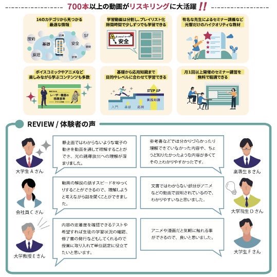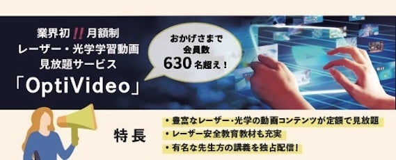 OptiVideoは、レーザーの専門家集団である当社が提供するレーザー・光学の学習者に向けた定額動画視聴サービスです。レーザー・光学の歴史、基礎からレーザー核融合や光量子コンピュータといった最新事情まで動画で学習できます。定期的にレーザー・光学各分野の著名な講師を招いてセミナーも行なっており、視聴可能な動画数は770 本を超えています(*)。レーザー・光学に特化した動画サービスでありながら企業、アカデミアの皆様からご好評頂き、会員数は630 名を突破しました(*)。
