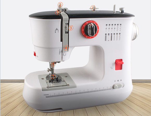 糸通しの手順は矢印図でわかりやすく表記され、①-⑦に設定するだけで上糸や下糸が簡単にセットされます。